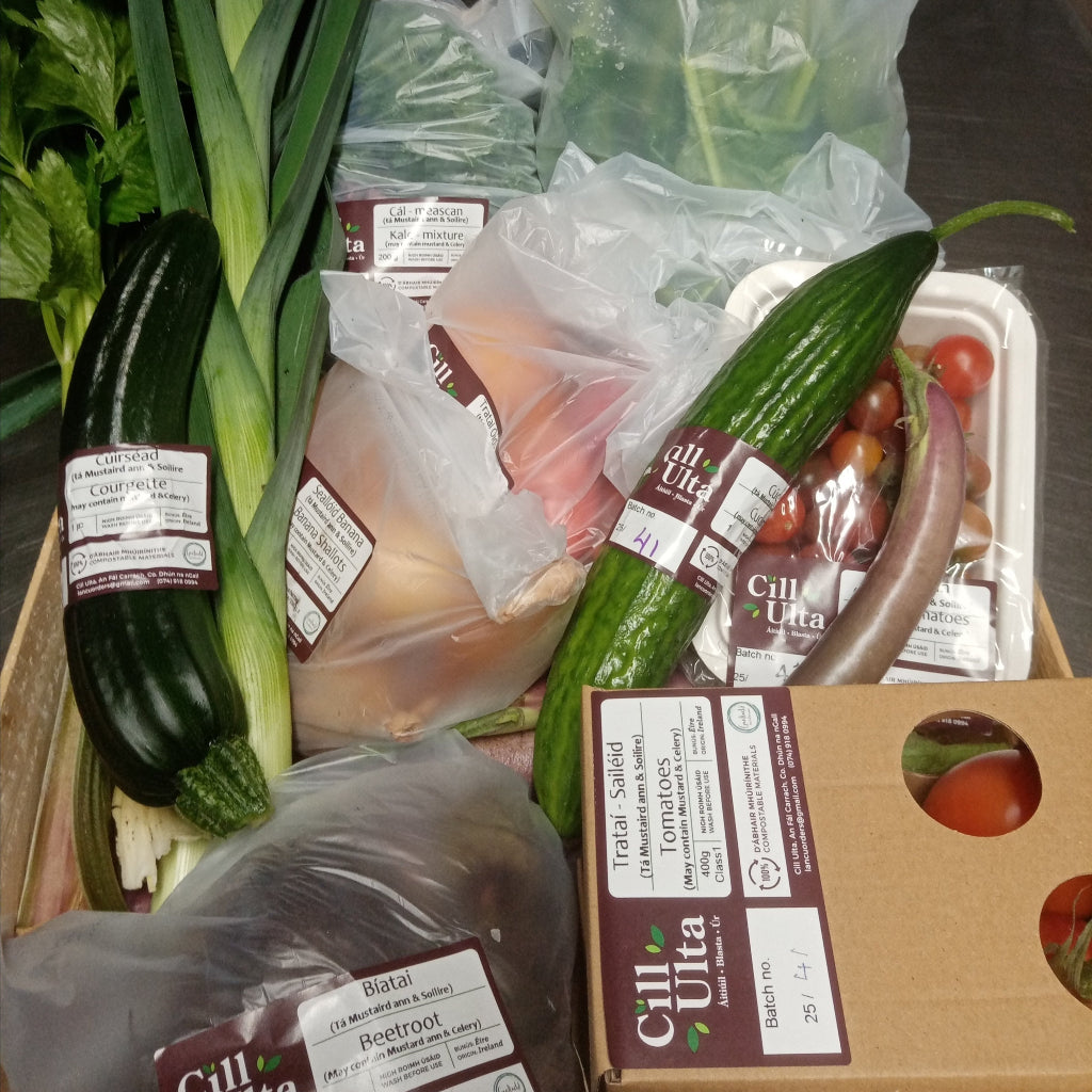 (Mar shampla: trataí, letís, spionáiste, cál, biatas bán, duilleogaí measctha, persil, cúirséad, cúcamar, biatas, póir. s.r.l.)